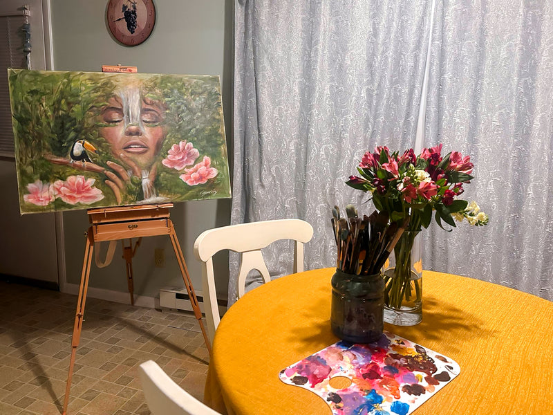 I intend to create portals into the eternal, inviting viewers into quiet, contemplative inner worlds and a sanctuary. I work from a place of faith, intuition, and deep sensitivity, often from my parents’ kitchen table while raising my two children. This season has taught me that meaningful art doesn’t require perfect conditions, only heart.